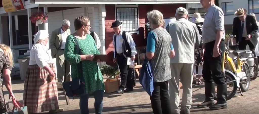 Kansaa oli ja kauppakin kävi torilla. Oikella mopon ja maitokärrin muodostama ajoneuvoyhdistelmä.