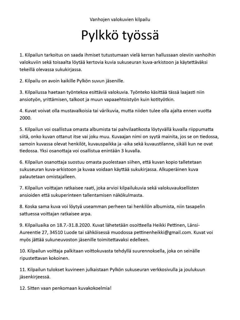 9. Kilpailuaika on 18.7.-31.8.2020. Kuvat lähetetään osoitteella Heikki Pettinen, Länsi-Aureentie 27, 34510 Luode tai sähköisessä muodossa pettinenheikki@gmail.com. Kuvat voi myös jättää sukuneuvoston jäsenille toimitettavaksi edelleen.